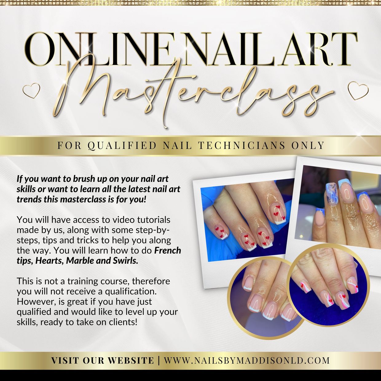 This Masterclass is all online, therefore you can learn in the comfort of your own home, in your own time. You will learn- French tips, Swirls, Marble and hearts. This masterclass includes a training manual, video tutorials and step by steps.
